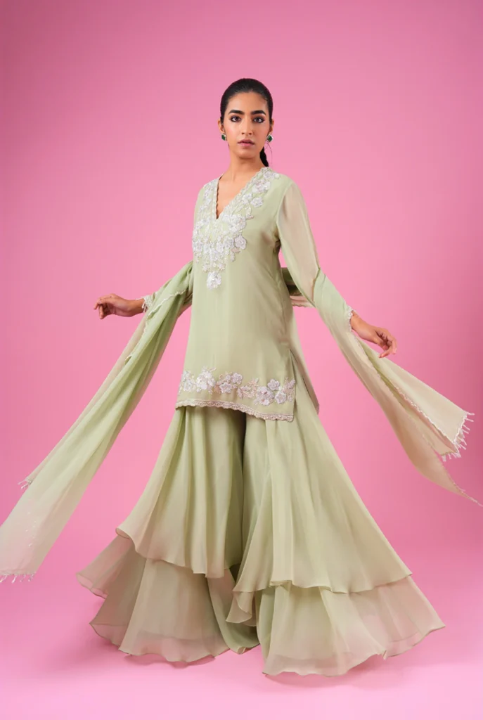 Her designs are a seamless blend of time-honoured Indian artistry and contemporary silhouettes — light, detailed, and innately feminine.